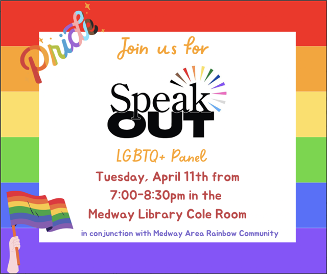 For this month's MARC support meeting they are partnering with the Medway Library to host SpeakOUT with some amazing LGBTQ+ speakers!